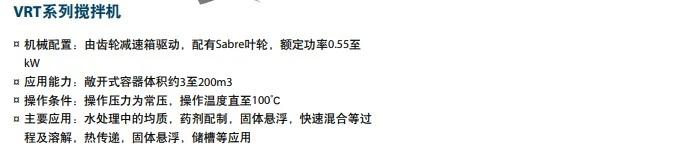 米顿罗搅拌机VRT系列搅拌机是在原米顿罗搅拌机的基础上,拓展开发的标准搅拌 机系列。其适用于溶液混合,