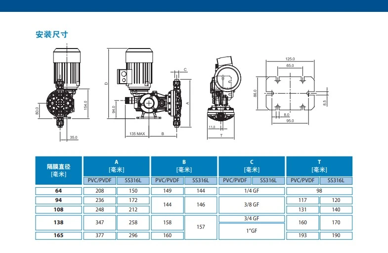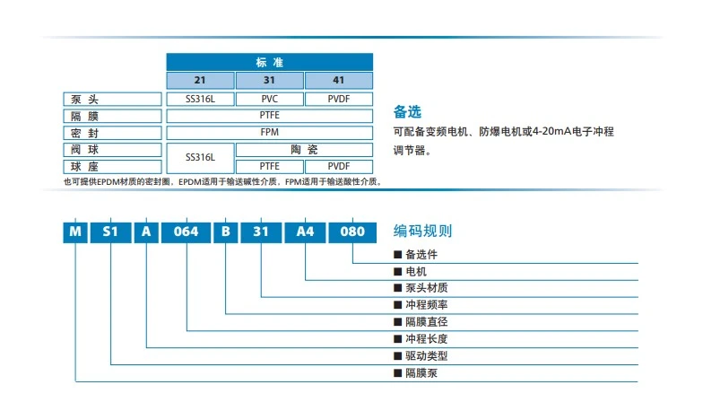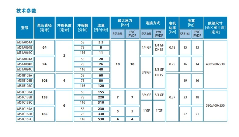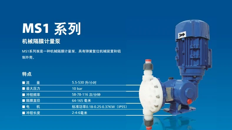 MS1系列泵是一种机械隔膜计量泵,具有弹簧复位机械装置和铝制外壳。