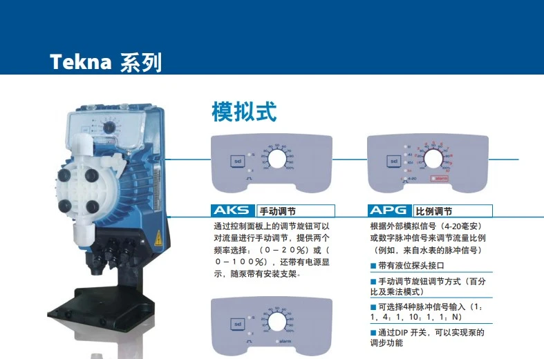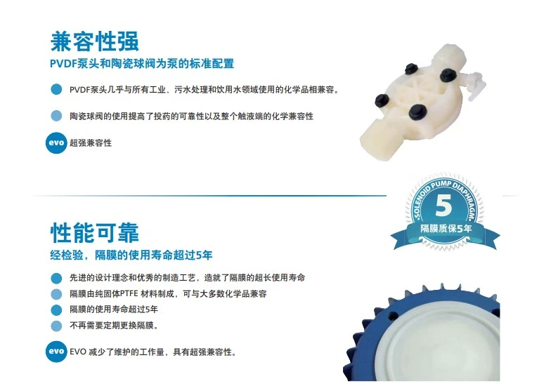 选型简单,标配PVDF泵头仅5种型号就覆盖了所有的流量范围,集电磁计量泵的所有功能于一身,而且每种型号均使用PVDF泵头。