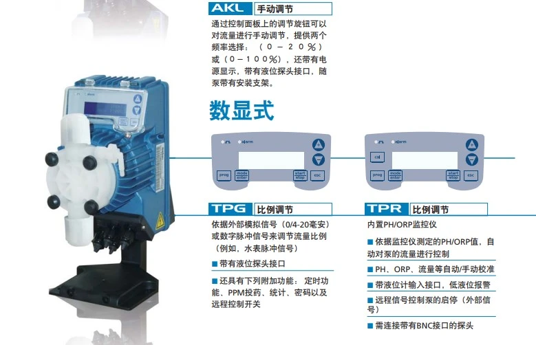 TPG系列是数显式/数字式电磁隔膜计量泵,依据外部模拟信号或数字脉冲信号调节流量比例,带有液体探头接口,具有定时功能,PPM投药,统计,密码以及远程控制开关等功能。